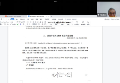 陈老师首先以优化算法的基础——格点法入手,配合值函数法和欧拉方程或贝尔曼方程法,讲述如何利用格点来求解较为复杂的动态优化。其次,还通过论文解读、公式讲解等方式,从专业视角对异质性DSGE模型构建及算法设定进行了具有条理性和逻辑性的论述分析。最后,陈老师将模型构建回归至企业,讲述了企业异质性DSGE模型构建的思路以及如何利用最有化方法解决企业资本存量决策问题。在提问环节陈老师还总结了:“学科绝非仅仅是一种纯粹客观知识的分门别类,它更代表了学术分工的一种特定责任;而问题的提出则是学者们的应有和普遍的责任”。