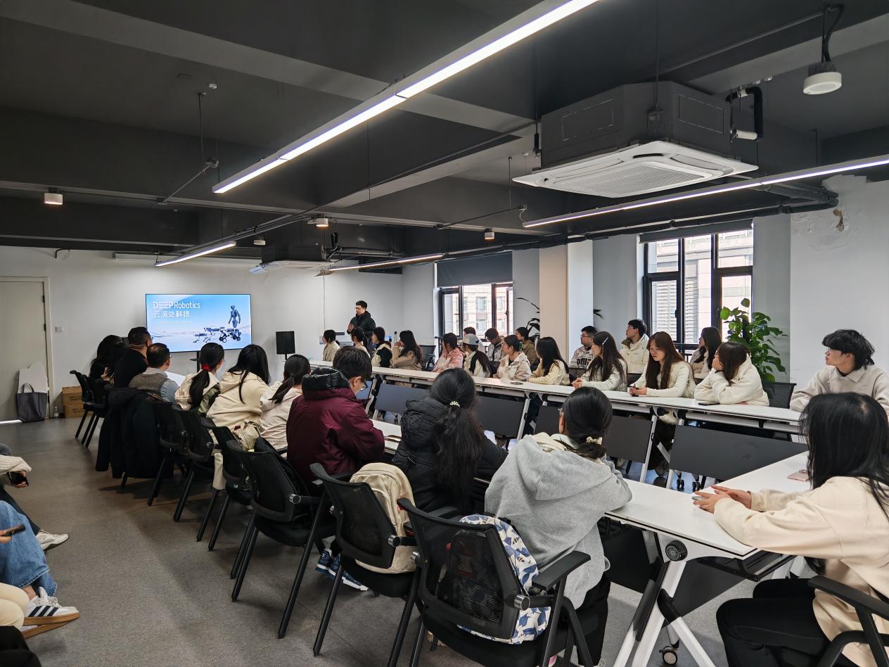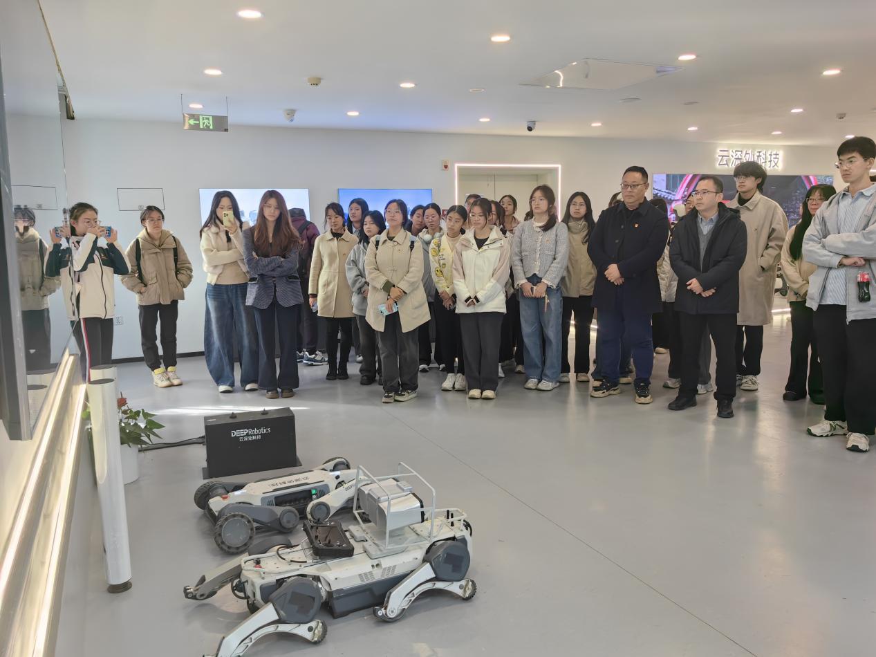 在云深处科技有限公司,师生们近距离感受机器人产业的创新成果与发展活力,并详细了解公司的发展历程、核心技术、多款功能各异的机器人产品及其在不同领域的应用案例。在随后的座谈会上,企业负责人以“四足机器人技术演进与行业赋能”为题,系统介绍了从实验室研发到产业落地的创新历程。师生们结合财经专业背景围绕“机器人产业链投资逻辑与政策导向”“机器人技术在民生领域的拓展路径”等问题踊跃提问,展现了跨学科思维在理解科技创新中的独特价值。现场气氛热烈、思想碰撞不断,师生对新时代青年服务国家战略的使命与方向有了更清晰的认识。