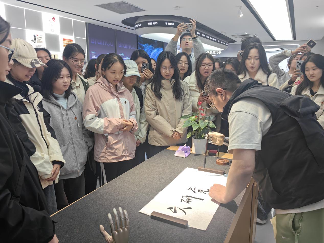 在强脑科技有限公司展厅,师生们在技术人员引导下,逐一体验多款代表行业前沿的脑科学设备。现场,一名佩戴智能仿生手的工作人员通过接受腔内电极实时捕捉并解析神经电与肌电信号,将其精准转化为仿生手动作,执笔流畅写下“文研党委”四个苍劲有力的毛笔字,并将这幅融合科技与人文的墨宝赠予师生党员,生动诠释了脑机接口技术在精细操作与人文表达中的突破性应用。多项互动体验不仅展现脑机接口技术的高灵敏度与实用价值,更让师生切身感受智能科技在康复医疗、人机交互等领域的广阔前景。